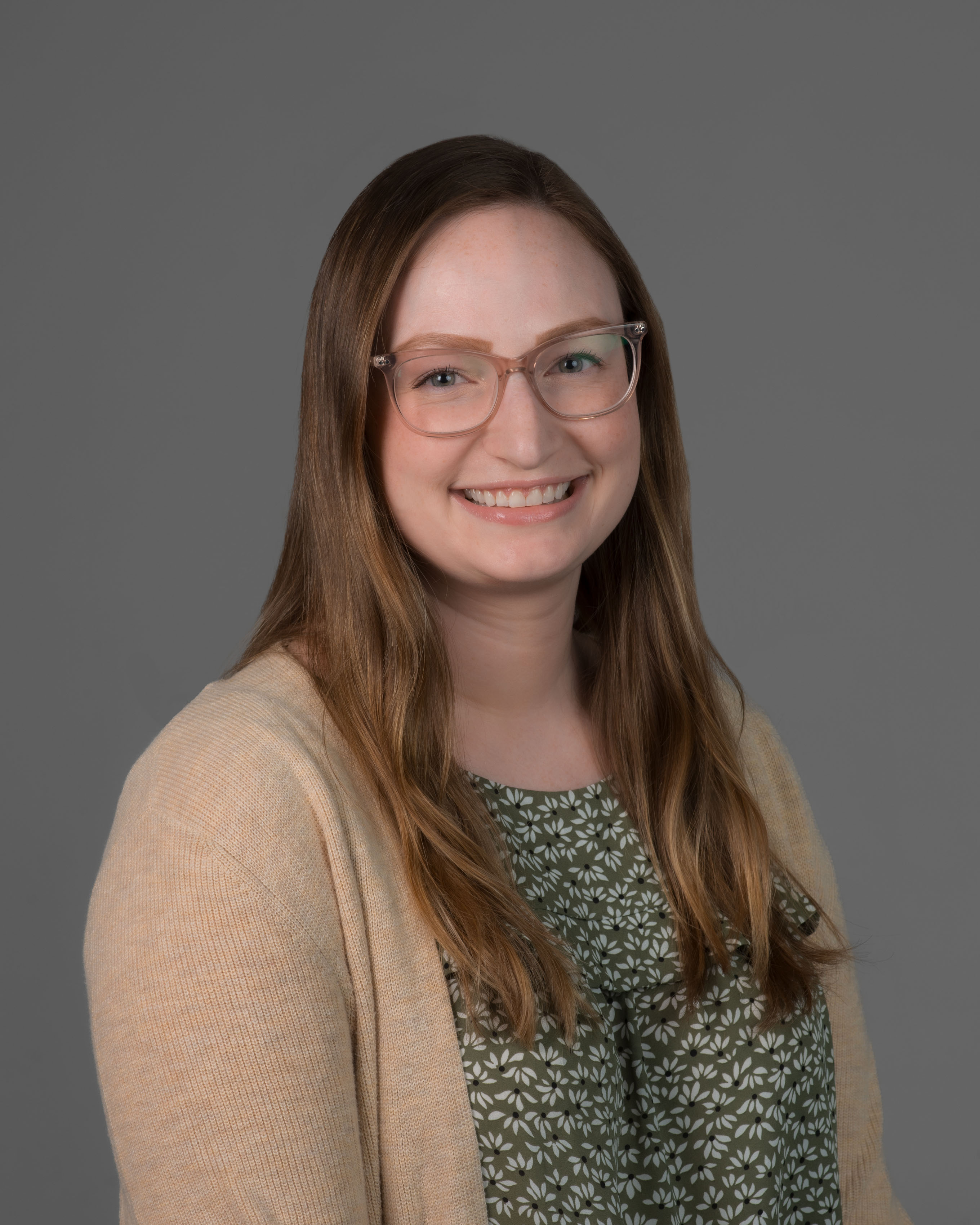 White woman with brown hair and clear glasses wearing a green shirt and cream cardigan.