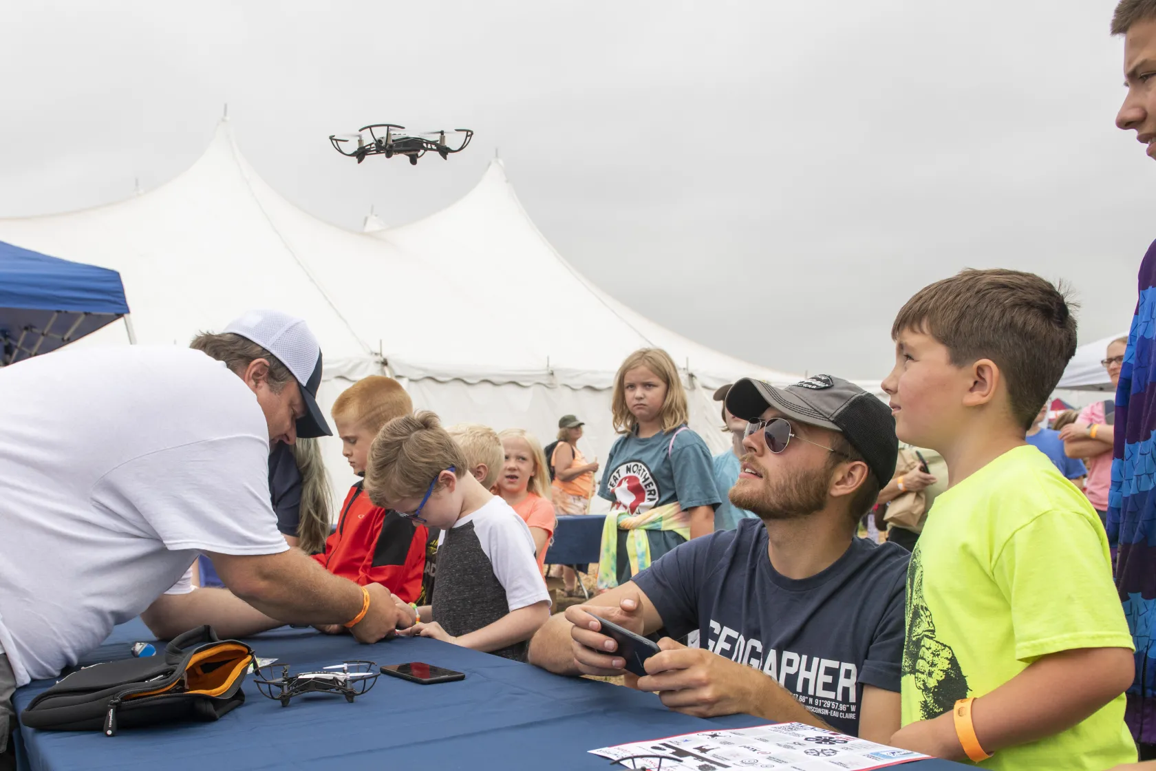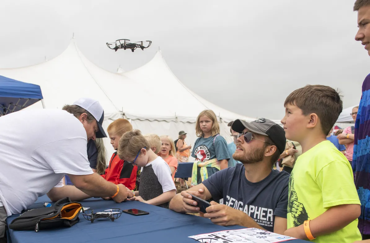 “I had a looping video of drone footage showing on one of the TVs and multiple drones set out for display and ready to show those interested what the drones can do. We also had a farming simulator game running on the other TV for kids to play,” Creviston says. “UWEC had two tents out front with their large drones, along with another tent station setup with toy drones for kids to fly using a mobile app. The line of kids waiting to fly the little drones was nonstop for most of the three-day event.”
