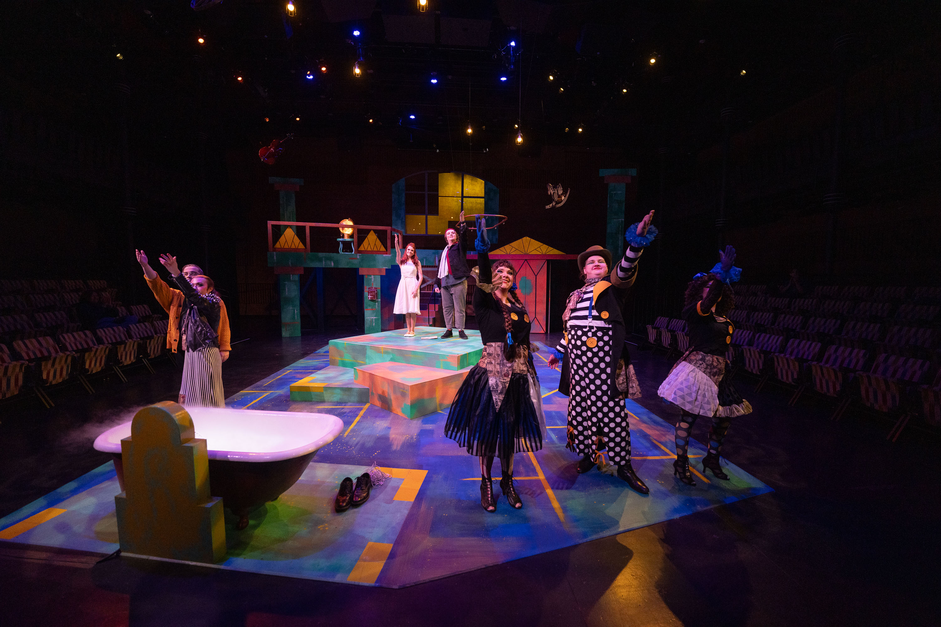 multicolored set, actors playing Eurydice and her father center stage