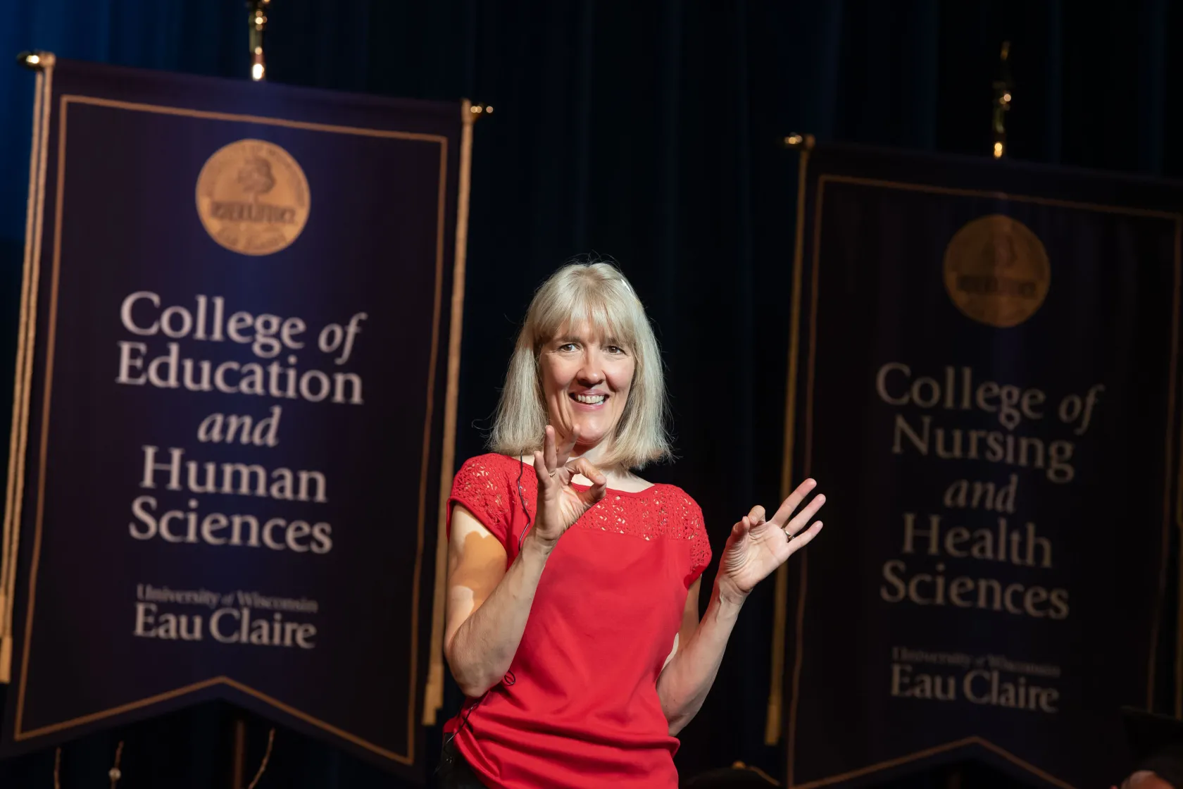 Kohn, who has taught multiple eight-week sign language classes through UW-Eau Claire Continuing Education, started signing at commencement in 1988 and interpreted more than 170 commencement ceremonies for 72,000 Blugolds, including three ceremonies on her final day.